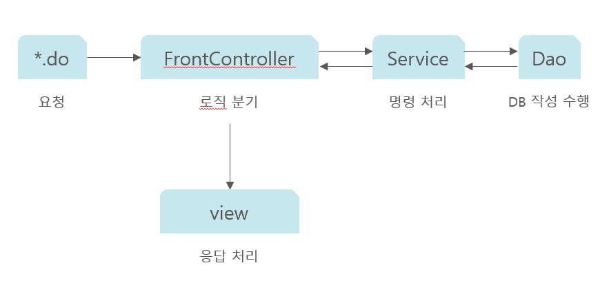 MVC패턴은 어떻게 구현이 되어있냐면, Servlet을 관리해주는 Tomcat에 web.xml에 FrontController하나만 넣어준 후, FrontController에서 모든 요청을 처리해준다.