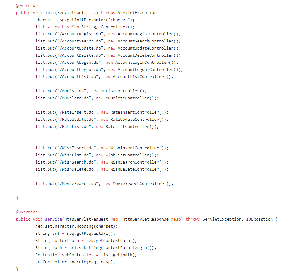 4. 그리고 FrontController의 init에서는 HashMap에 각 Controller들을 put해준다.