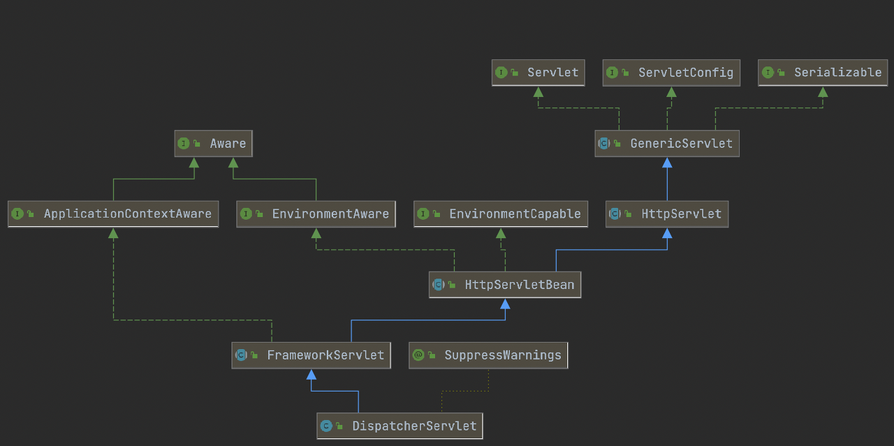 Dispatcher Servlet또한 실제로 구현이 되어있는 모습을 보면 HttpServlet을 상속받고 있어 하나의 Servlet으로 동작하고 있음을 확인할 수 있다.