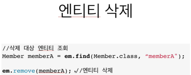 삭제는 em.remove()를 통해 삭제를 하게 되는데, 이 부분도 persist를 하지 않아도 트랜잭션 커밋 시점에 delete문이 나간다.