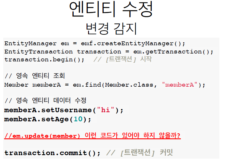 아마 엔티티를 조회하고, 그 값을 수정하고 싶을 때 em.update를 해줘야 하지 않을까 하는 생각이 들 수 있다.
