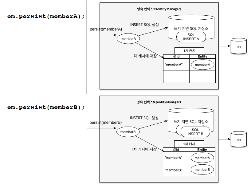 이게 무슨 말이냐면, JPA는 버퍼랑 비슷하게 em.persist()단계에서 바로 쿼리문을 보내지 않고 쓰기 지연 SQL저장소에 쿼리문을 쌓다가 commit을 하면 flush() 과정을 거치는 데, 이때 한번에 쿼리문을 보내게 된다.